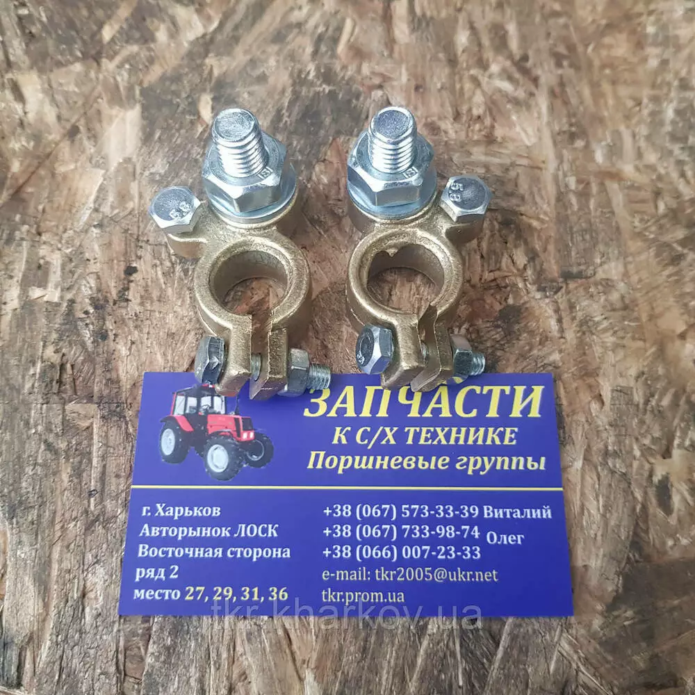 Клеми латунні забезпечують надійність закріплення, мають підвищену довговічність і міцність.Матеріал виготовлення — латунь, завдяки цьому забезпечується добра струмопровідність. Клеми акумуляторні гарантують з'єднання силового кабелю й акумуляторної батареї між собою в системі електрообладнання тракторів МТЗ.